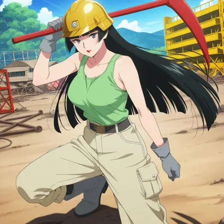 Construction Uniform: (The_Guts, The_Guts-Ooshima_Mutsuki, Ooshima Mutsuki, Grey eyes, Black Hair, Long Hair, Blunt Bangs, Hime Cut, Large Breast, red lips, red lips, tank top, pants, belt, gloves, helmet, boots)