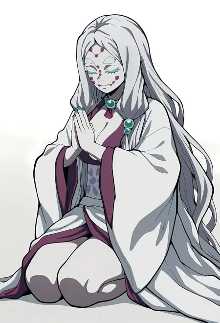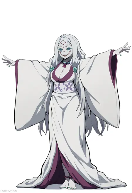 demon slayer style, 1girl, ruimother, white hair, hair ornaments, long hair, red face markings symmetrical face markings, white eyebrows, green eyelashes, white skin, no pupils,