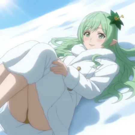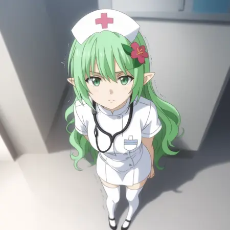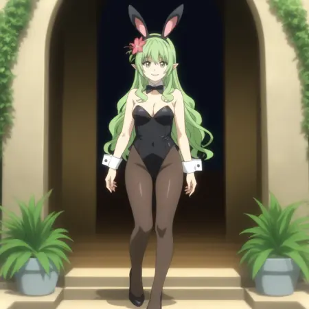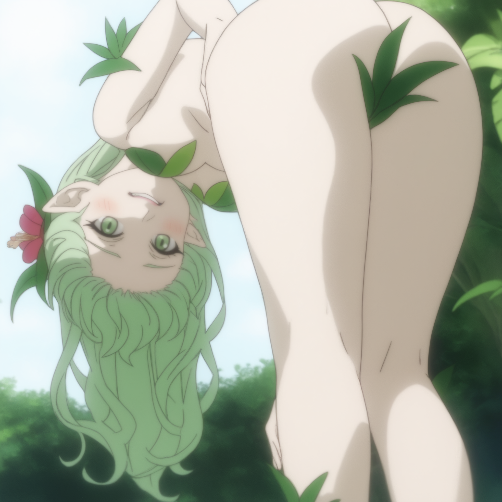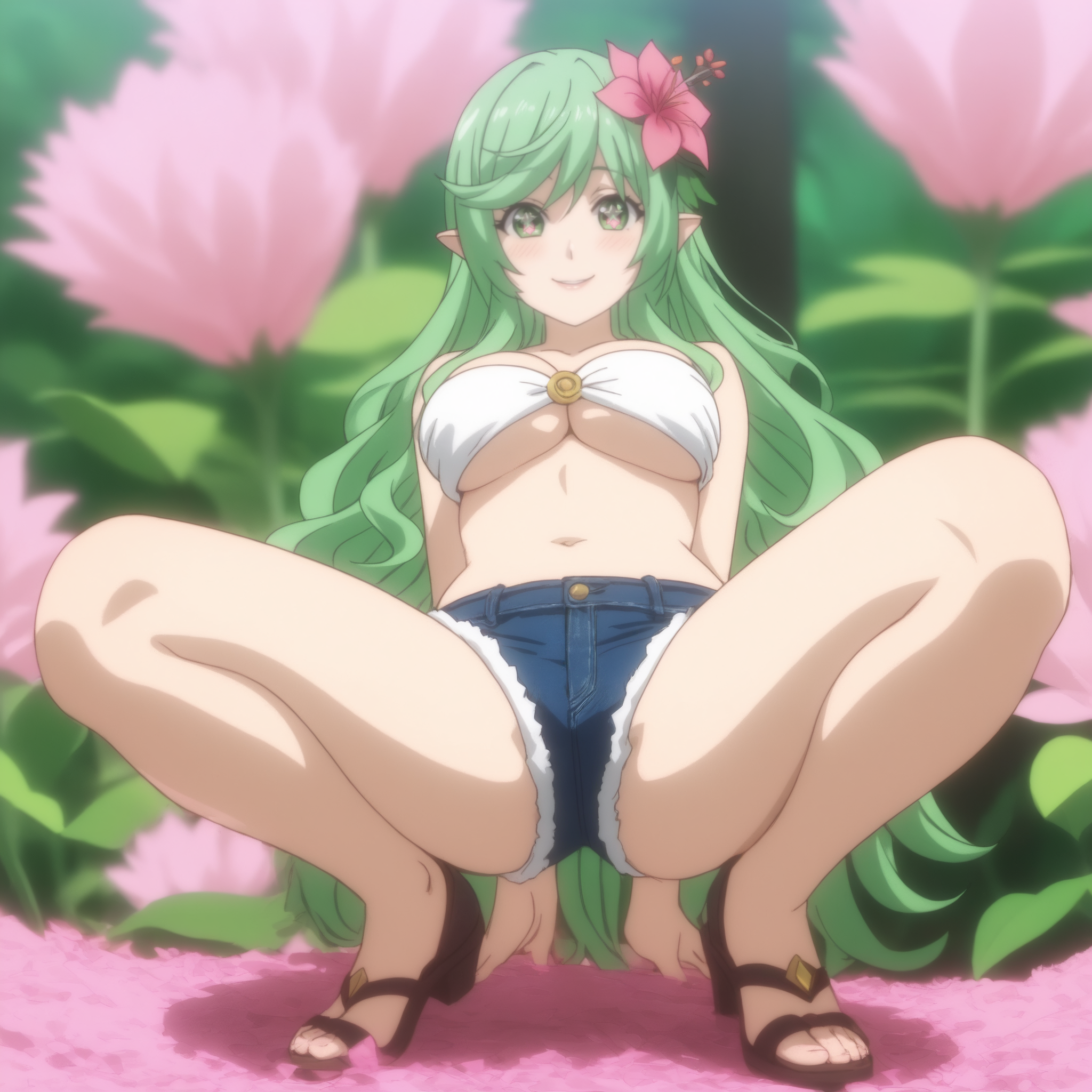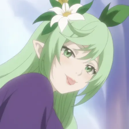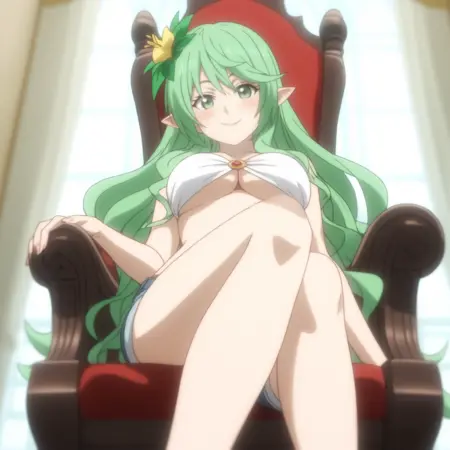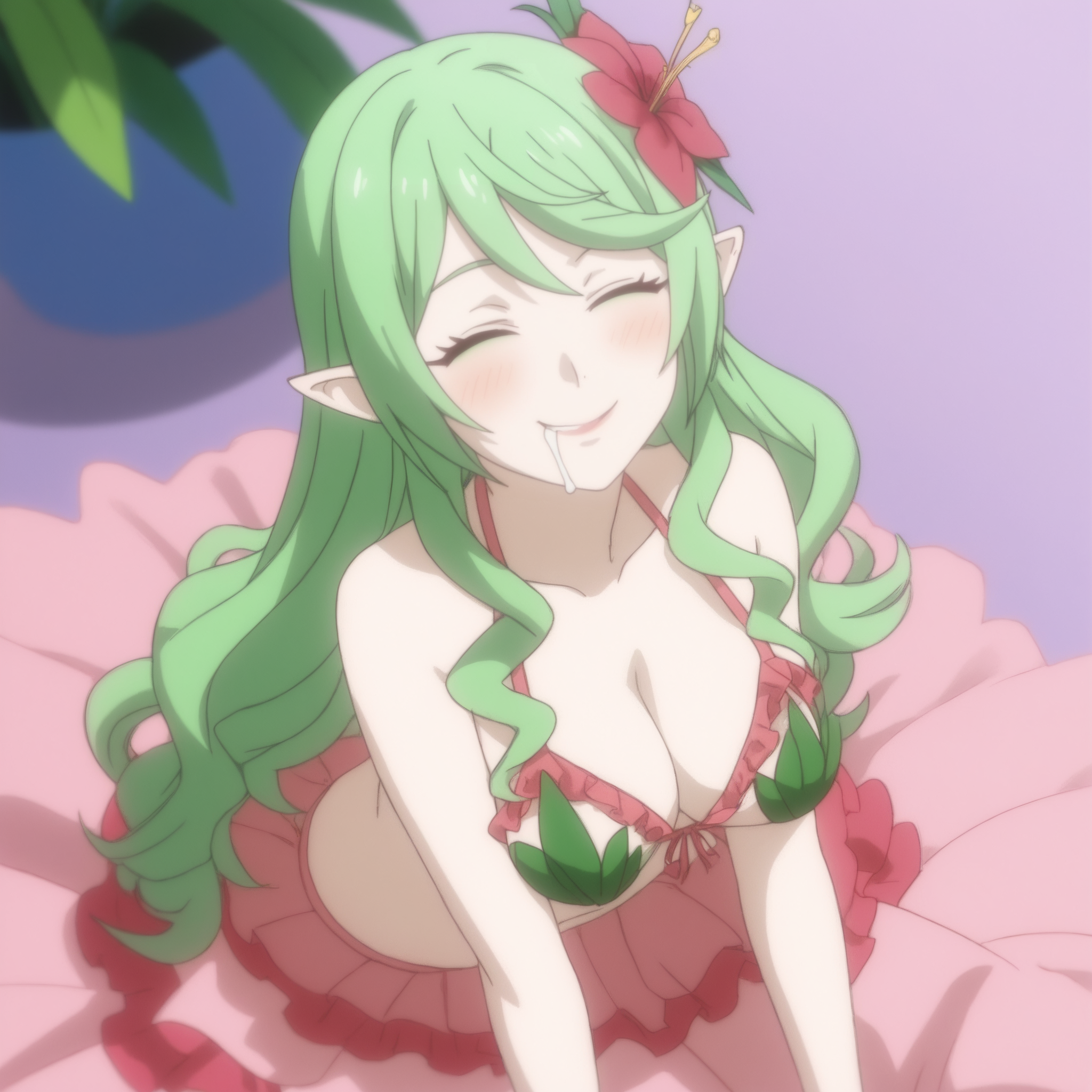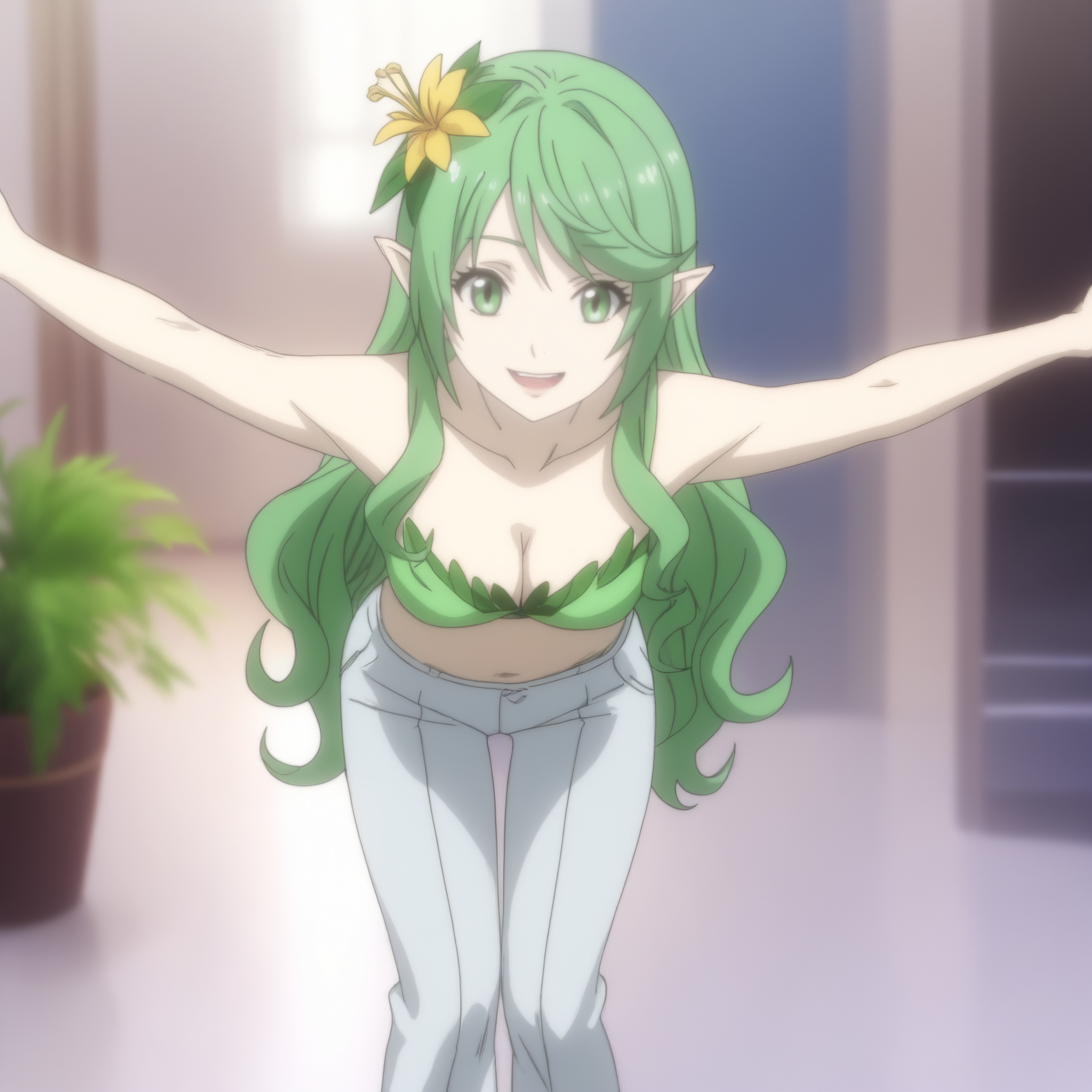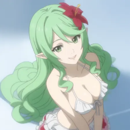 ReMonsterDoriane, green eyes, green hair, long hair, pointy ears, hair ornament, plant girl, monster girl, hair flower,