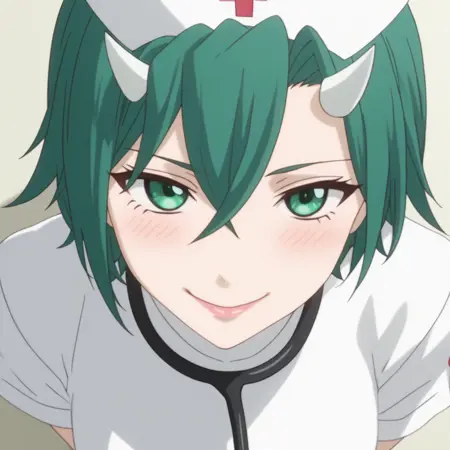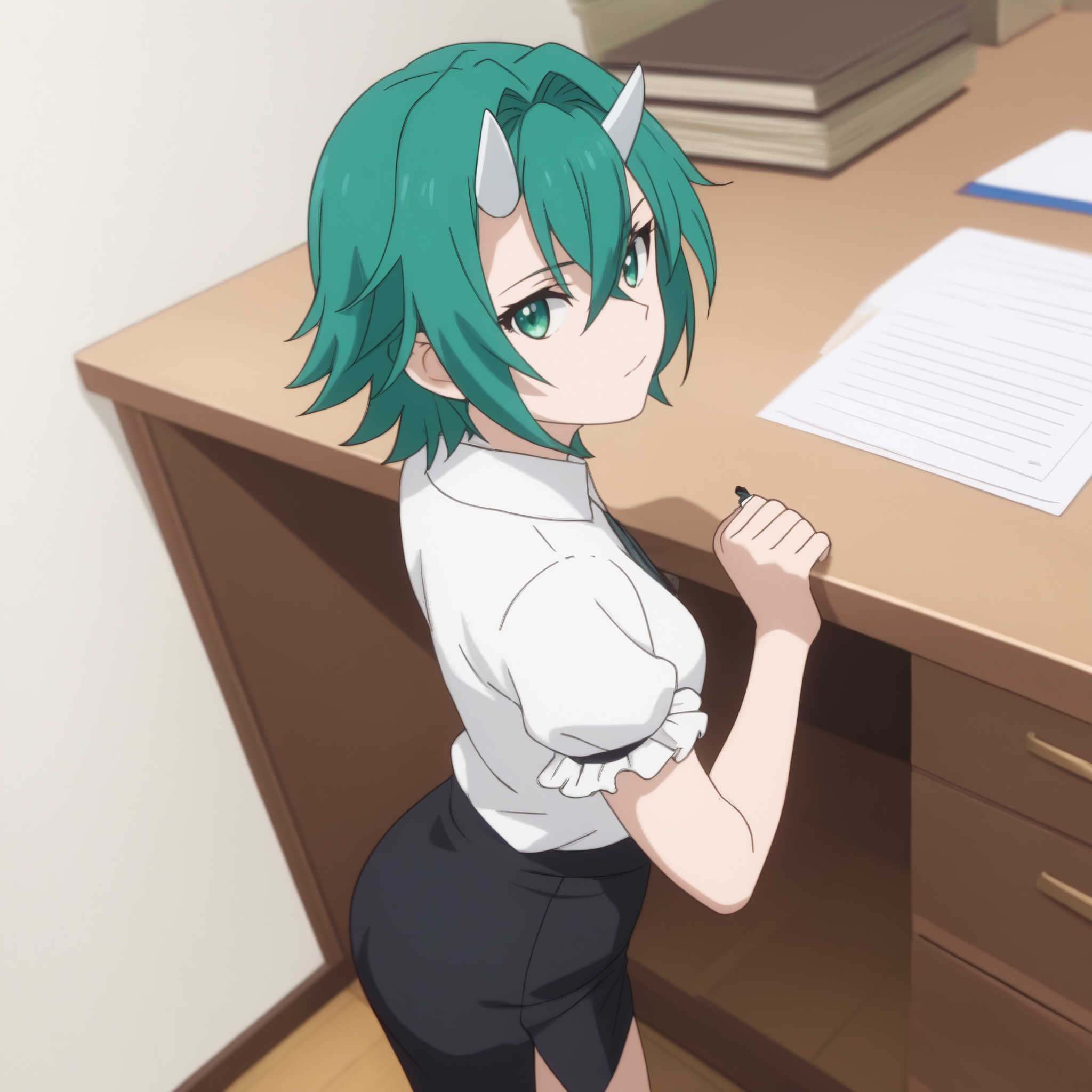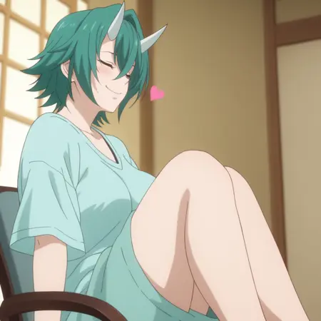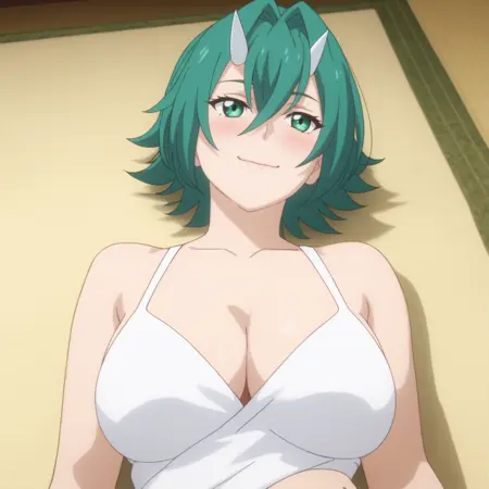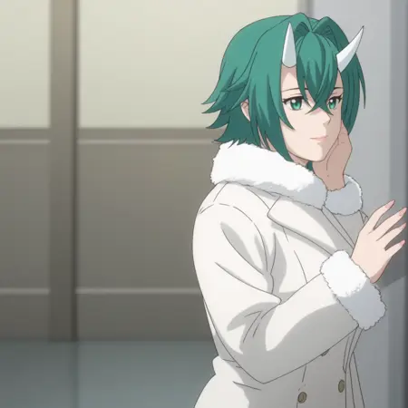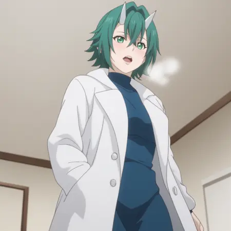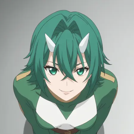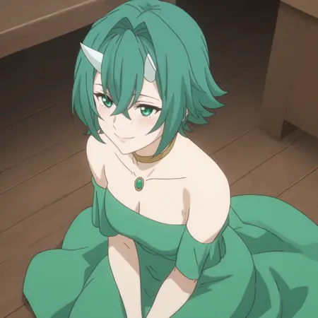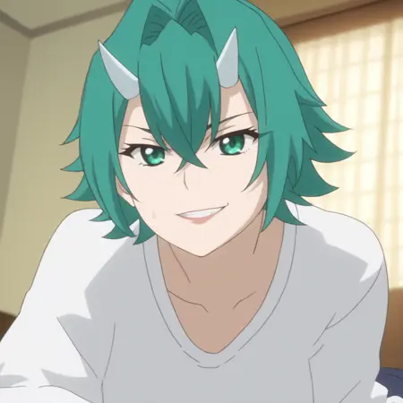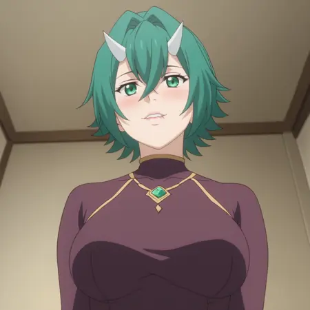 ReMonsterFuuki, 녹색 눈, 녹색 머리, 단발, 눈 사이 머리, 뿔, 뾰족한 귀,