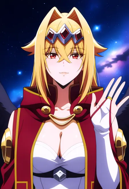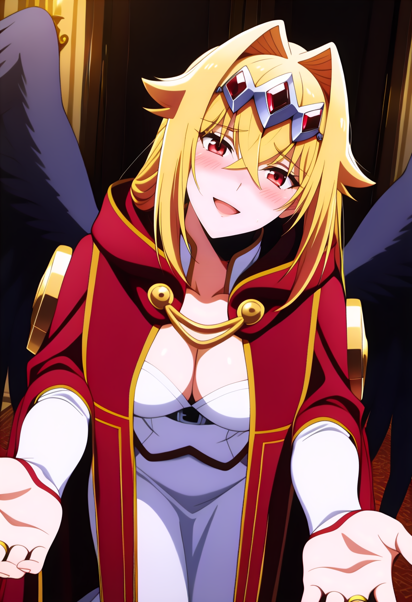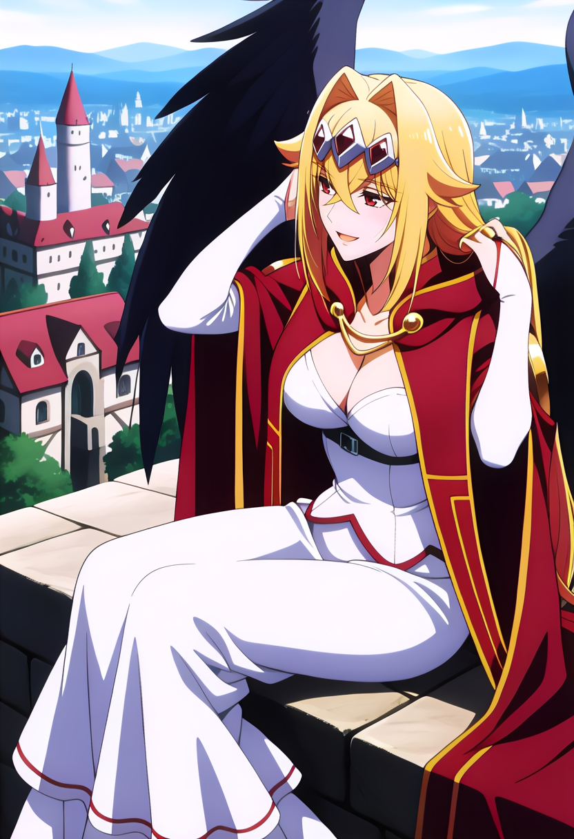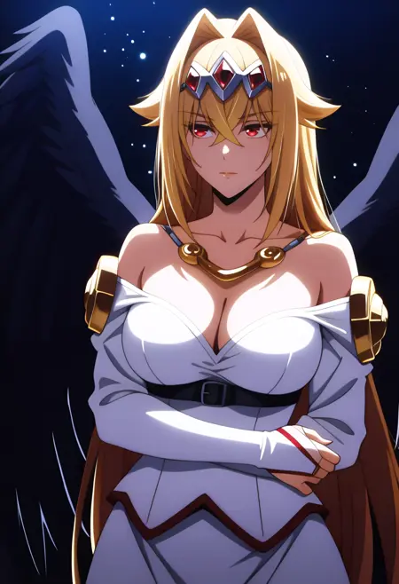 Note: This Ver was not Trained On Shots Without The Cloak (you can remove the red cloak of course), i did it with fewer images in the showcase, if you want that use the following prompt ( 1girl, solo, blonde hair, very long hair, hair between eyes, crossed bangs, hair intakes, headpiece, red eyes, large breast, || cleavage, collarbone, long skirt, white skirt, layered skirt, white shirt, off shoulder shirt, bare shoulder, collarless shirt, long sleeves, detached sleeves, bridal gauntlets, underbust, black wings, angel wings, feathered wings )