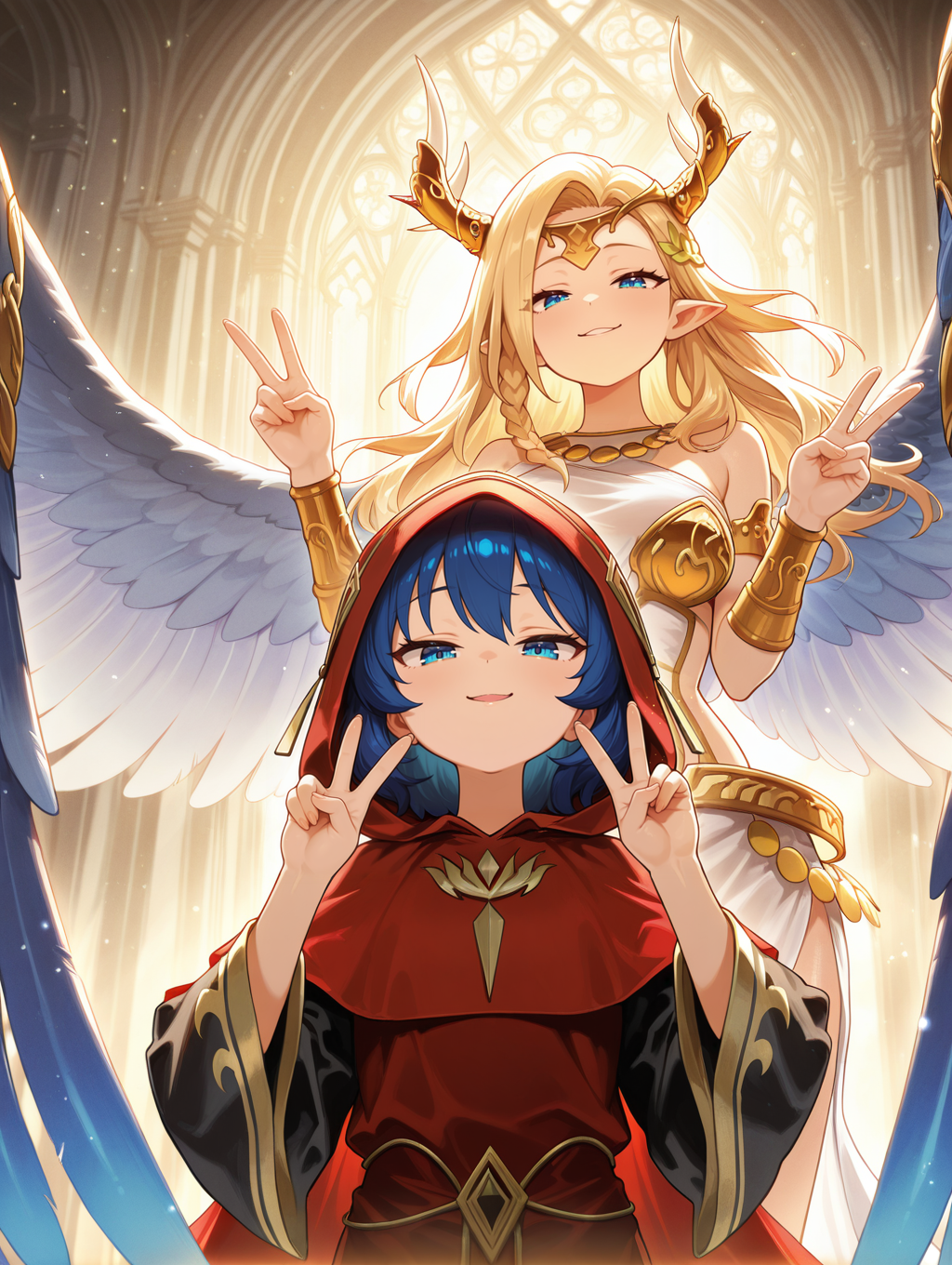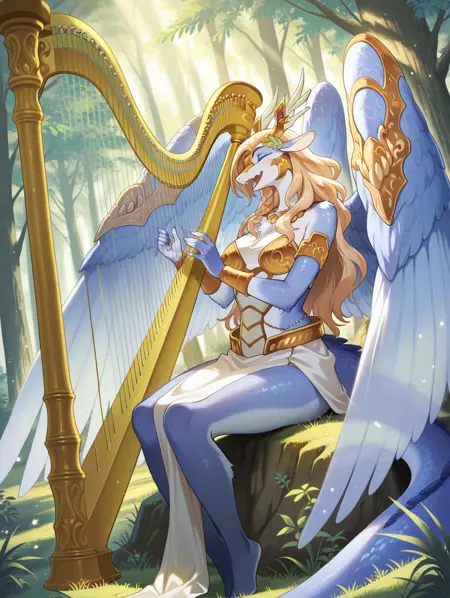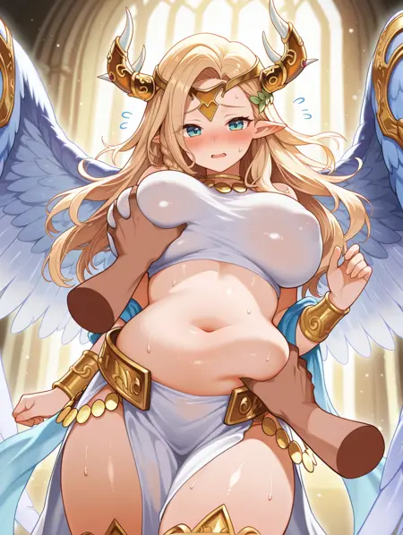 タグ(衣装):金の太ももアーマー、金の足首輪、金の月桂冠、金のネックレス、金の胸当て、白い無袖ドレス、金の腕輪、金のブレスレット、透けた羽衣、金の翼アーマー