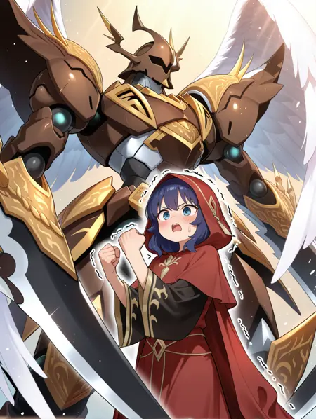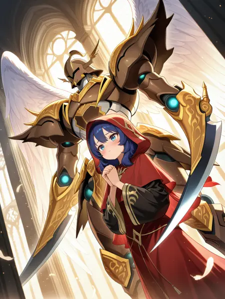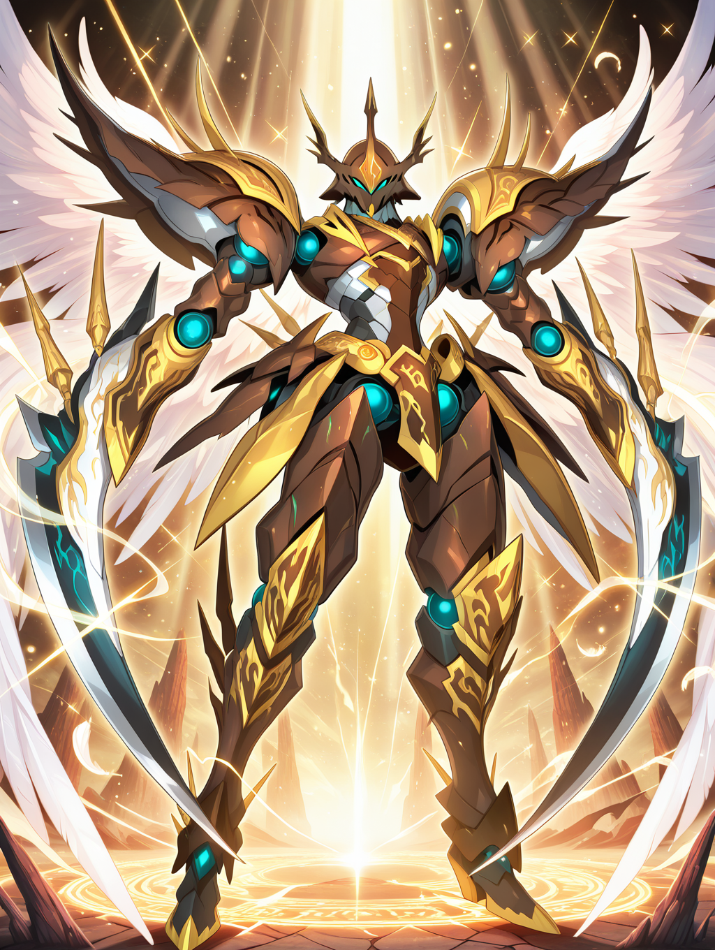 タグ(キャラクター2):無声の声の守護者スカル、1other、男性焦点、人間なし、ロボット、両手武器、SF、茶色の鎧、白い天使の羽、茶色のヘルメット、顔を覆う、腕のブレード