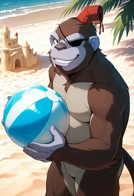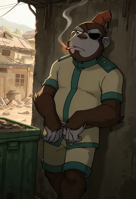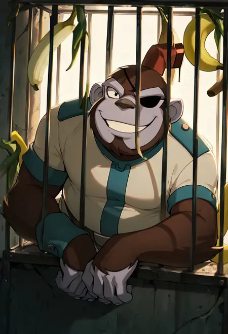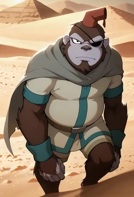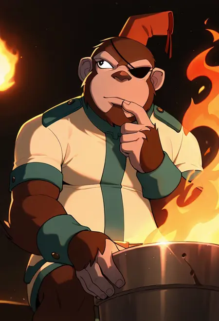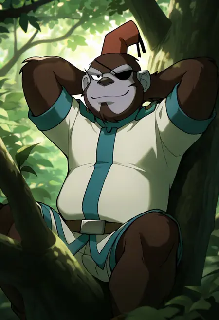 bobohaha, male focus, facial hair, furry, 1boy, eyepatch, beard, furry male, monkey, black eyes, hat, short sleeves, green clothing, blue sleeves,