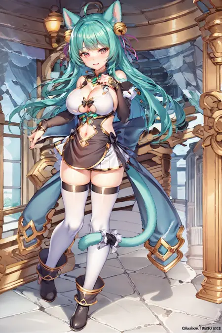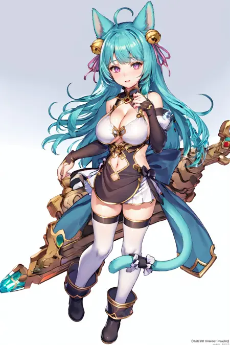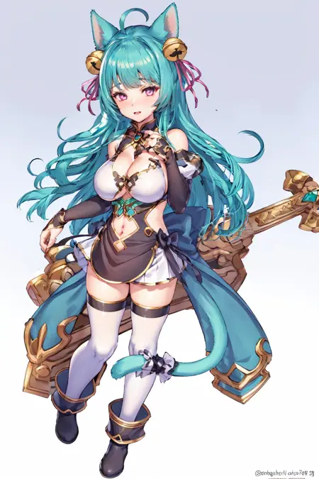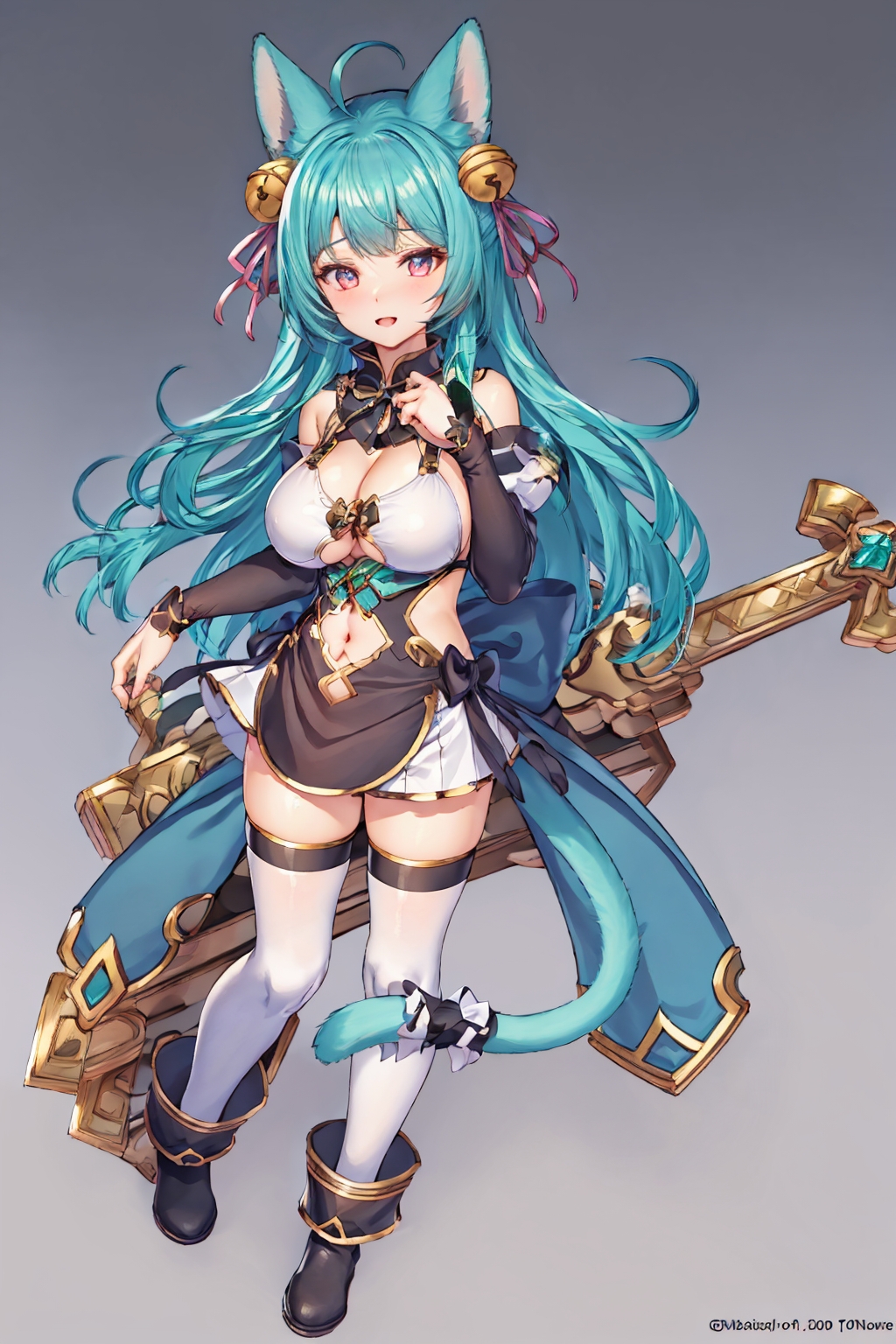 ahoge, 동물 귀 털, 머리 꼬리铃, 분홍색 머리 리본, 긴 머리, 아쿠아 색 머리, 분홍색 눈, 어깨 노출, 분리된 소매, 가슴 노출, 가슴 컷아웃, 언더부브, 언더부브 컷아웃, 큰 가슴, 흰색 브라, 리본 브라, 녹색 리본, 허리 앞치마, 검은색 앞치마, 배꼽, 배꼽 컷아웃, 앞치마 아래 치마, 흰색 치마, 흰색 허벅지 양말, 검은 부츠,