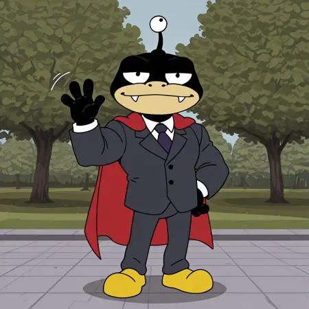 1boy, Nibbler, alien, not human, small, cartoonish, rounded head, (two large white eyes), (single antenna with a small white eye on top), black pupils, black fur, yellow belly, yellow snout, paws, four fingers, red cape, yellow shoes,