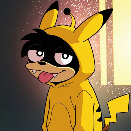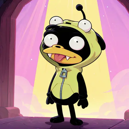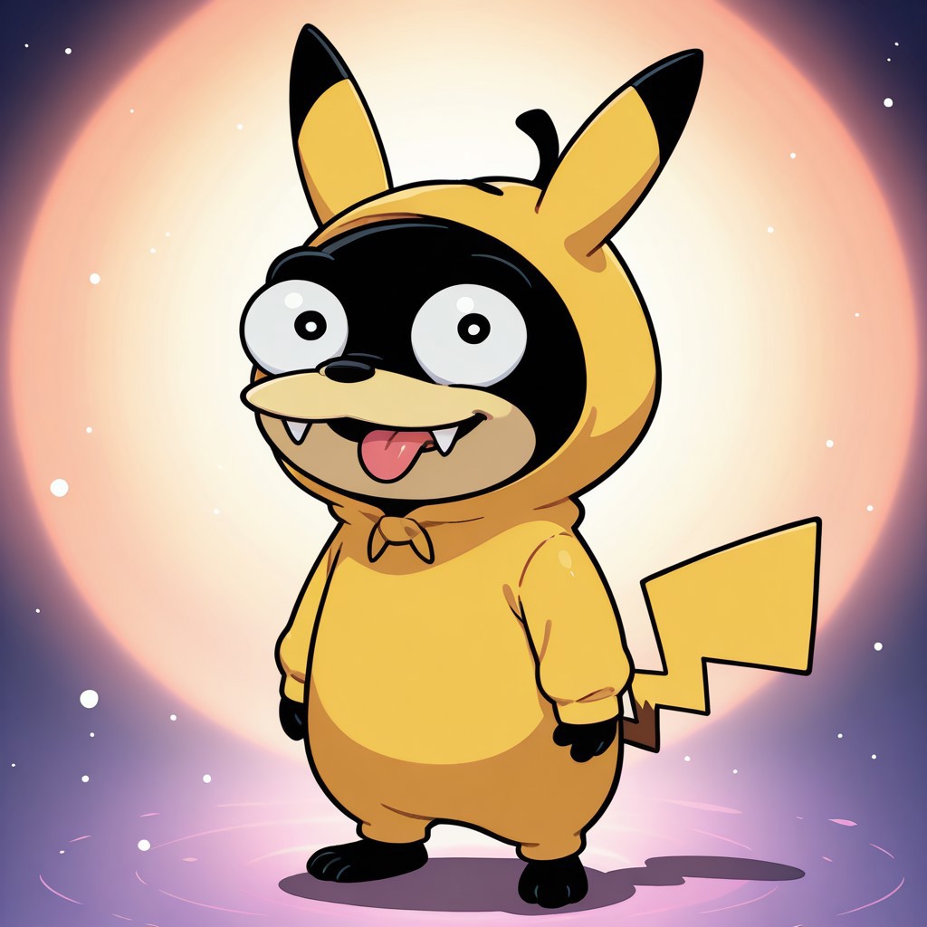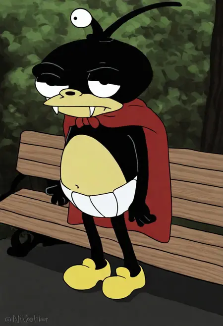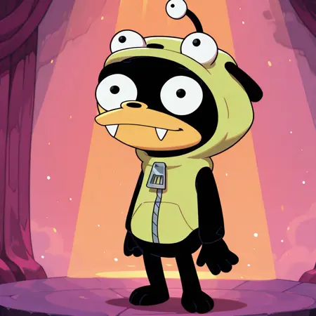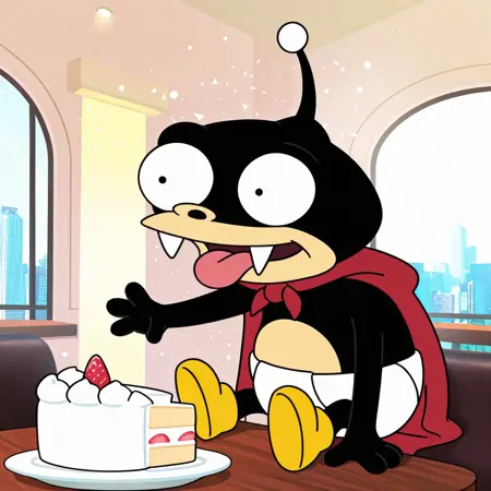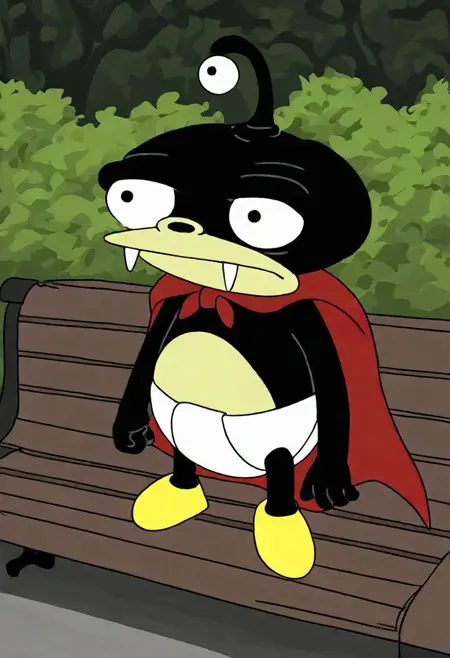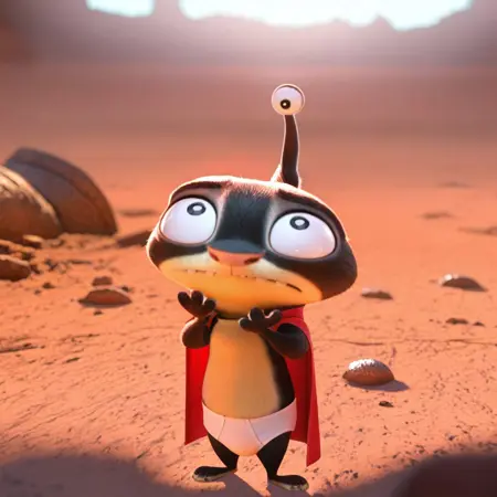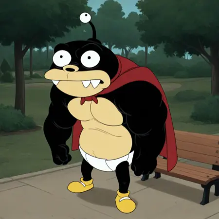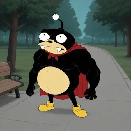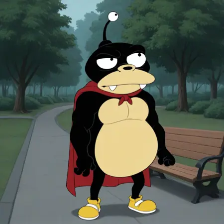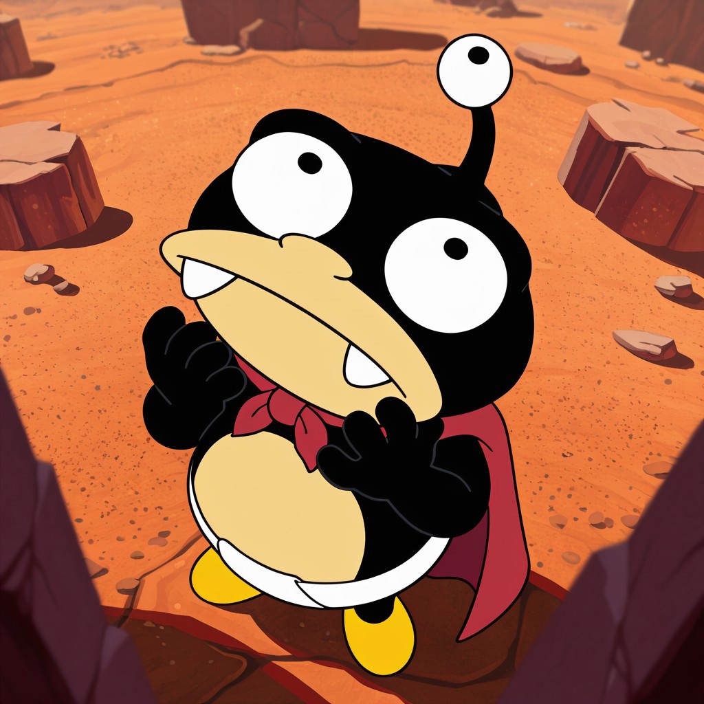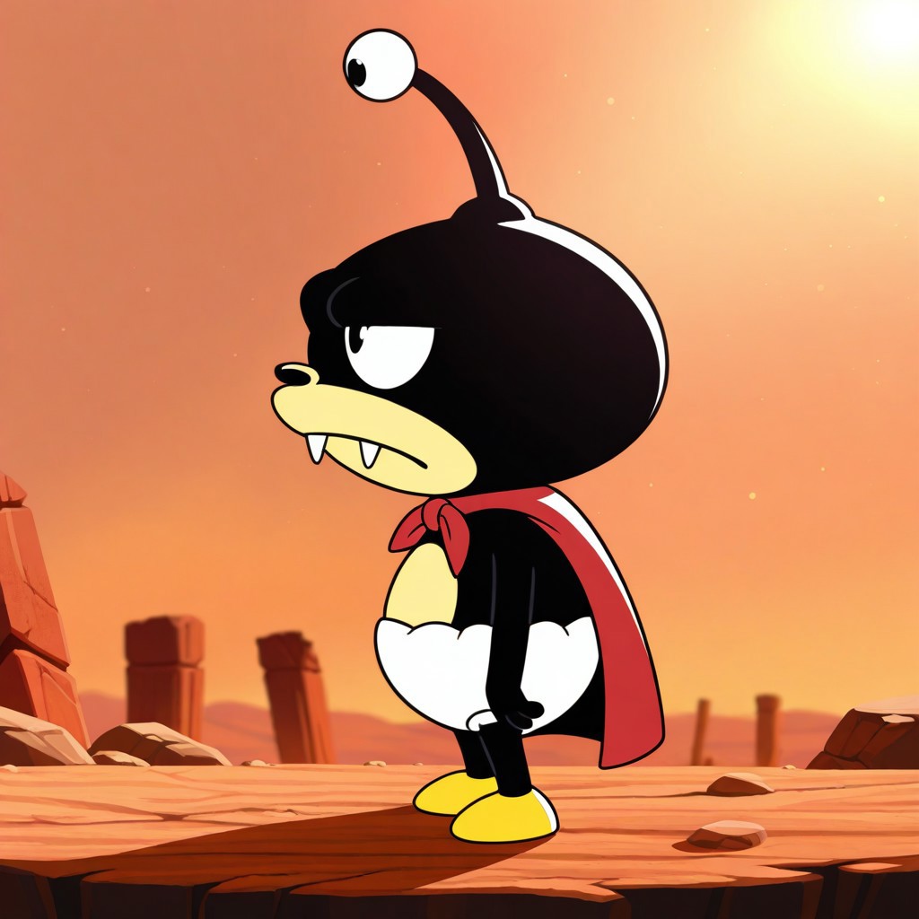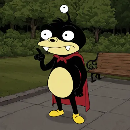 1boy, Nibbler, alien, not human, small, cartoonish, rounded head, (two large white eyes), (single antenna with a small white eye on top), black pupils, black fur, yellow belly, yellow snout, paws, four fingers, red cape, yellow shoes,