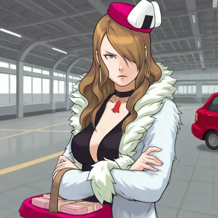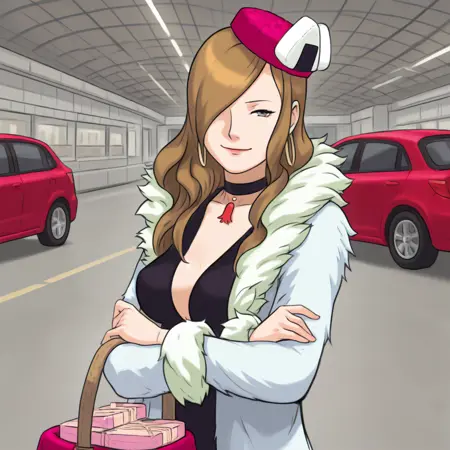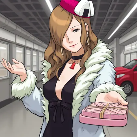 衣装タグ:ファーのコート、ファーのトリム、黒いドレス、チョーカー、ピンクの帽子、おにぎり、フープイヤリング、ハイヒール