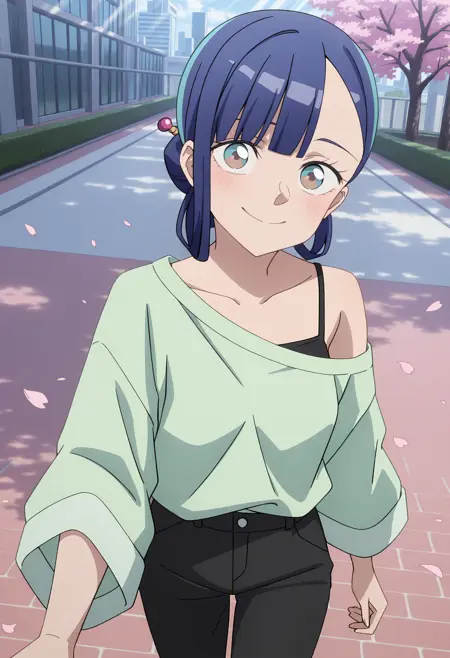 TowaTowasa, 이색 안구, 아쿠아 눈, 갈색 눈, 파란 머리, 긴 머리, 비대칭 앞머리, 귀 뒤 머리 — 대안 헤어스타일을 원하면 “업두, 헤어 스틱” 추가