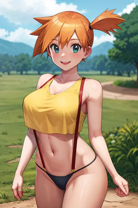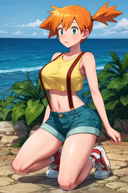 1girl, misty (pokemon), orange hair, solo, shorts, suspenders, side ponytail, orange hair, midriff, yellow crop top, navel, short hair, denim, denim shorts