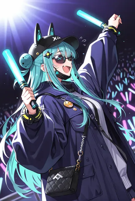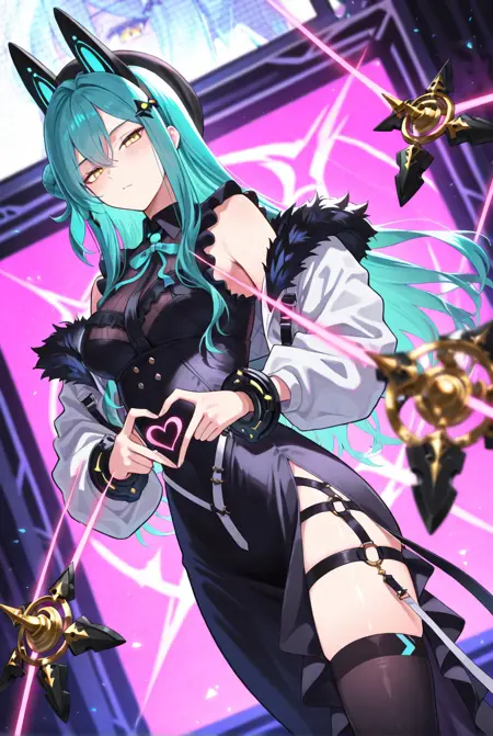 default costume : hat , fake animal ears , ( aqua ) neck ribbon , ( black ) frills , black dress , sleeveless , (fur-trimmed ) cropped ( white ) jacket , off shoulders , wristcuffs , see-through , belt , ribbon , o-ring , thigh strap , black thighhighs ;