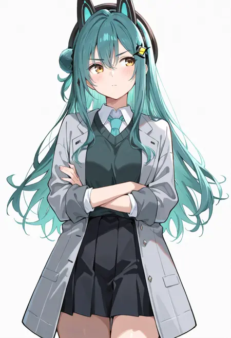 - デフォルトの服装:帽子、仮の動物の耳、(水色)首リボン、(黒)フリル、黒いドレス、ノースリーブ、(ファー trim)短めの(白)ジャケット、肩出し、手首カフス、透け感、ベルト、リボン、Oリング、太ももストラップ、黒い太ももハイストッキング;