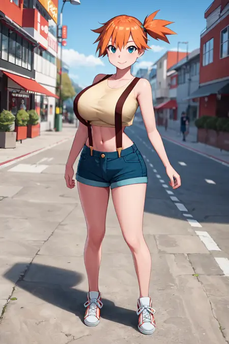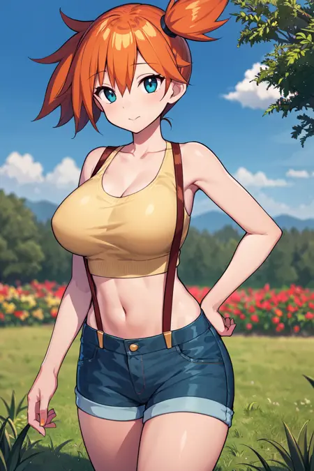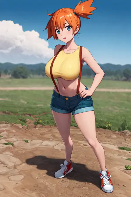 1girl, misty (pokemon), orange hair, solo, shorts, suspenders, side ponytail, orange hair, midriff, yellow crop top, navel, short hair, denim, denim shorts