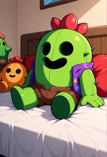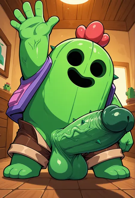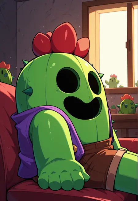 Basic activation words: spikebs, 1boy, green skin, cactus, spikes, hollow eyes, black eyes, brown shorts, purple vest, spike, cactus, smile, open vest, red flower,