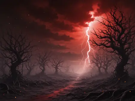 dead trees, gnarled roots, red sky, lightning, mist, crimson ground, desolate path, burning embers, storm clouds, shadowed landscape