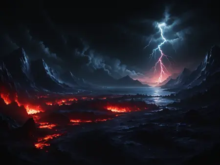 outdoors, dark sky, heavy clouds, night, scenery, mountain, dark, lightning, terrifying landscape, ocean, fire, molten rock