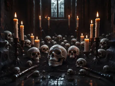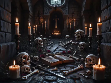 indoors, flower, sword, book, depth of field, plant, fire, scenery, skull, candle, skeleton, bone, arch, candlestand, window, open book, stone floor, stone wall, candlelight