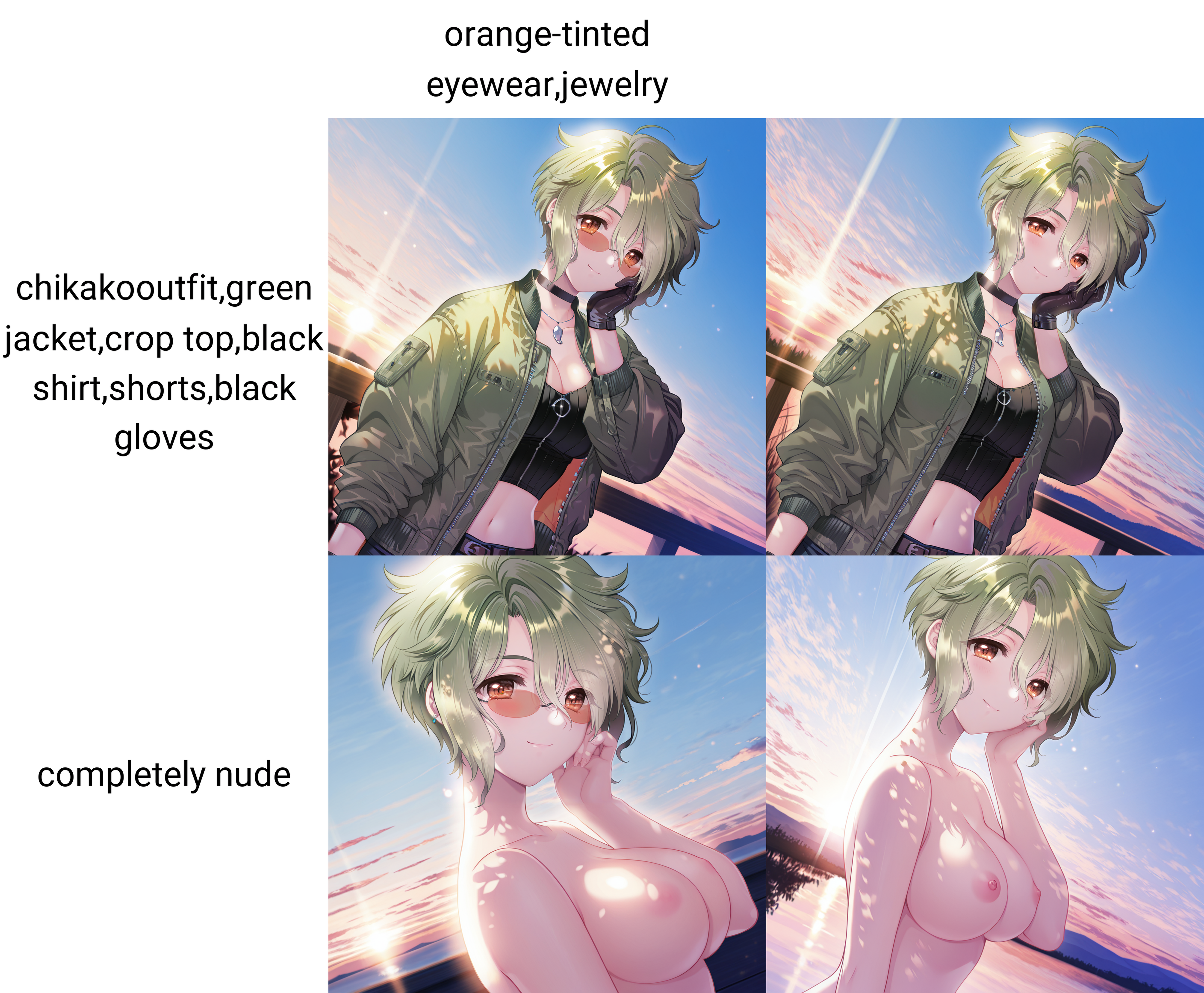All V1 individual LoRAs are semi-pruned. What does this mean? It means that most of the concepts have been trigger words for the character and outfit, but some have been intentionally left so that they can be edited. Unless I am releasing a LoRA of multiple characters I leave hair style, hair color, breast size, and eye color to where they can be changed. There is also some flexibility built into the outfits as well, but not so much as a completely unpruned dataset would provide.