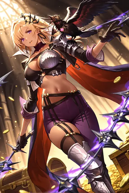 (黑色)项圈,(黑色)短夹克,胸带,黑色上衣,胸甲,服装开叉,(胸部露肤),腹部,(肌肉),袖子卷起,手套,(黑色 / 紫色)长裤,不对称腿部服饰,大腿绑带,单侧(黑色)过膝靴,大腿开叉,(靴子);