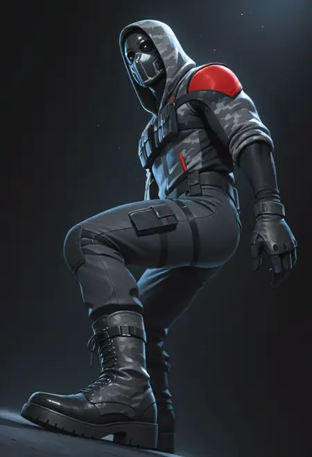 선택적 트리거 단어: 전술용 복장, 회색 디지털 캠코, 각진 얼굴판, 어두운 매트 원단, 빨간 어깨 장식, 홈이 파인 하네스 스트랩, 금속 버클, 전술용 장갑