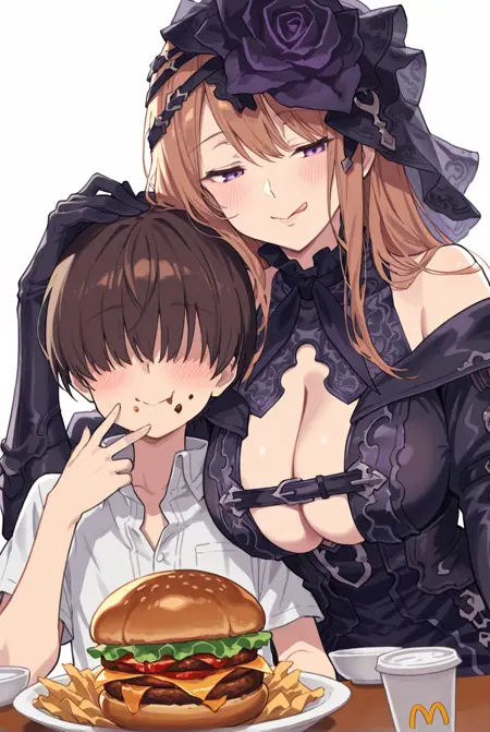 • 모자, 모자 꽃, (머리) 베일, 레이스 장식, 머리 장식, 터틀넥, 목 리본, 홀터넥, 프릴, 검은 드레스, 어깨 노출 / 넓은 칼라, 가슴 스트랩, 갑옷, 장갑, 장갑, 허리 망토, 허벅지 긴 양말, 무릎 부츠;
