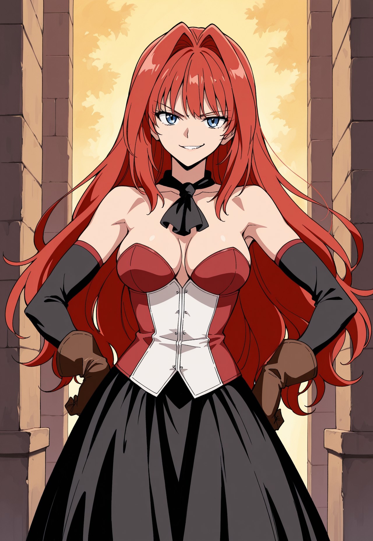 - neckerchief, bustier, bare shoulders, dress, detatched sleeves, brown gloves,