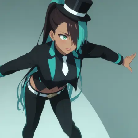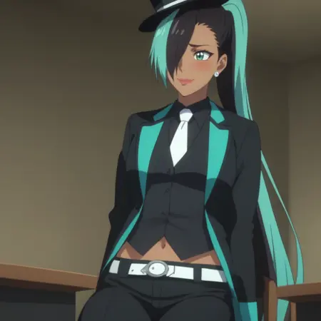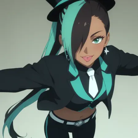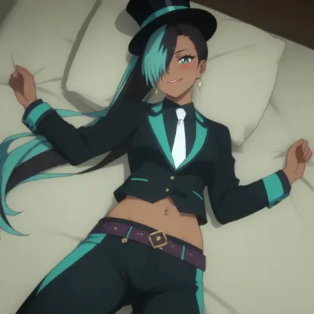 迷你高帽,黑色头饰,黑色衬衫,黑色夹克,敞开式夹克,黑色背心,有领衬衫,白色领带,长袖,露脐,肚脐,黑色长裤,腰带,