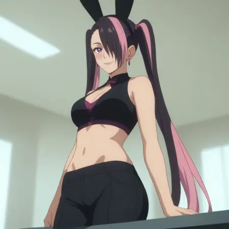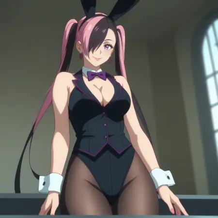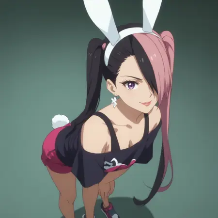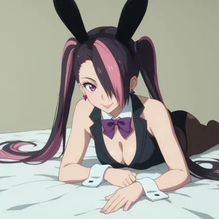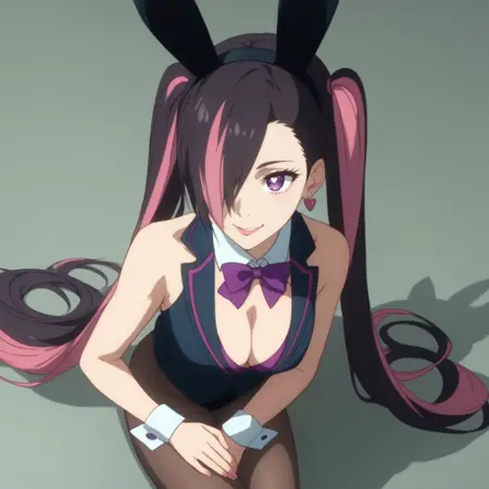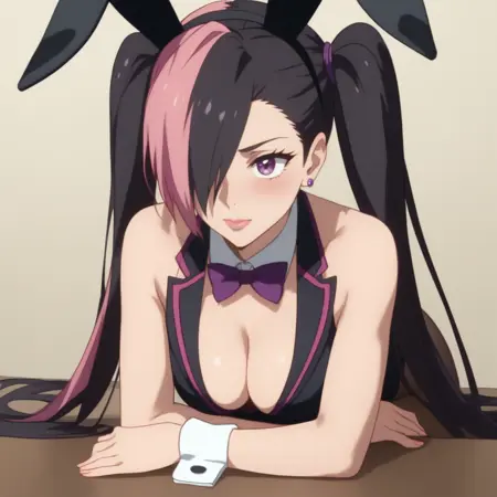 MandaraBunny,紫色眼睛,超长发,多色发,双马尾,头发遮住一只眼睛,黑发,粉发,双色发,不对称刘海,长发,假动物耳朵,兔耳,耳环,
