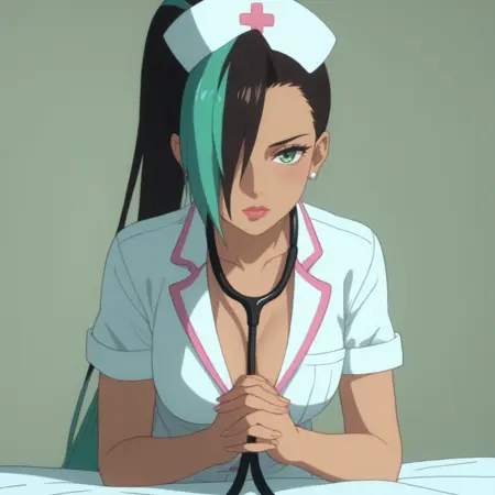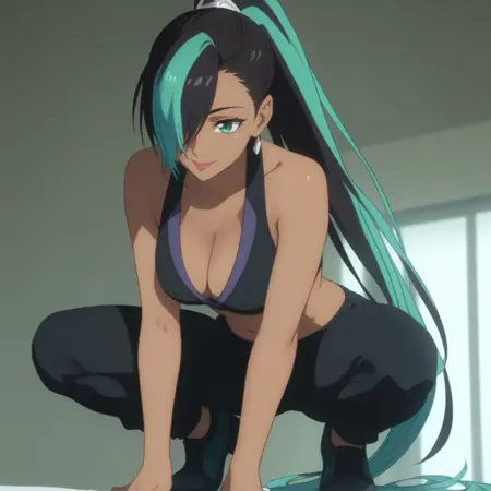 MandaraHat,绿色眼睛,超长发,多色发,马尾辫,头发遮住一只眼睛,黑发,绿发,双色发,不对称刘海,耳环,深肤色女性,