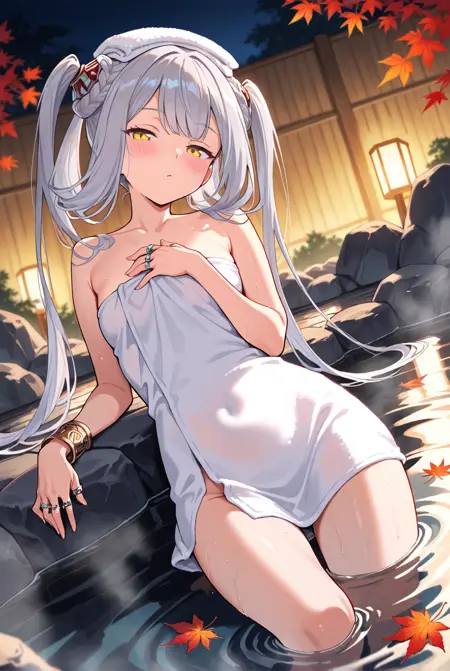 - 白いドレス、金のトリム、ジュエリー、服のカットアウト、青いローブ/ケープ(肩に)、広い袖、部分的に指先が開いた手袋、ブレスレット、(指輪)、タッセル、装飾、黒いパンティーホース、ガーターストラップ、太ももブーツ;