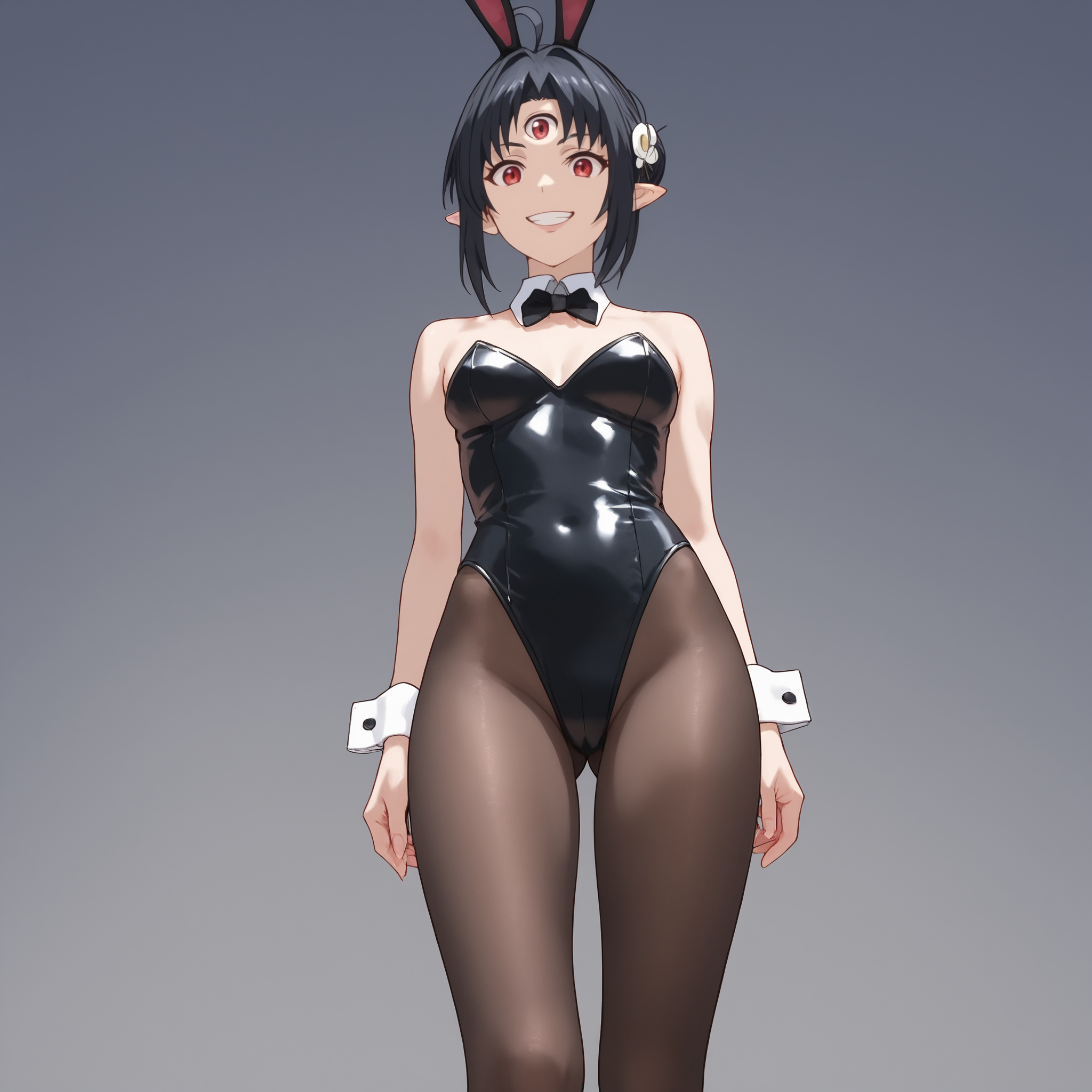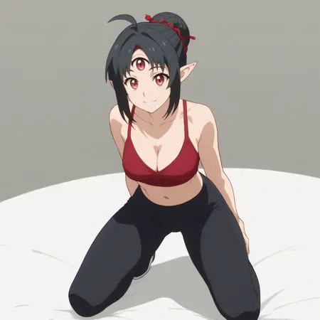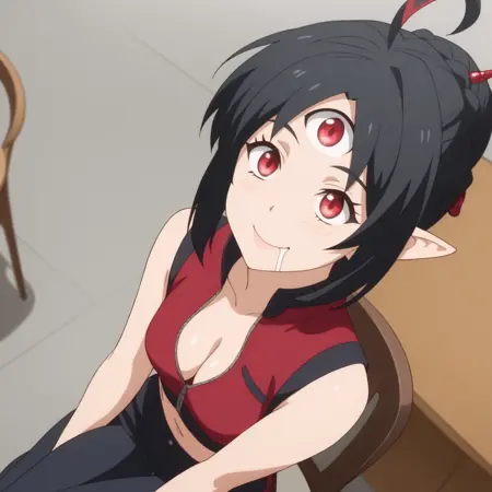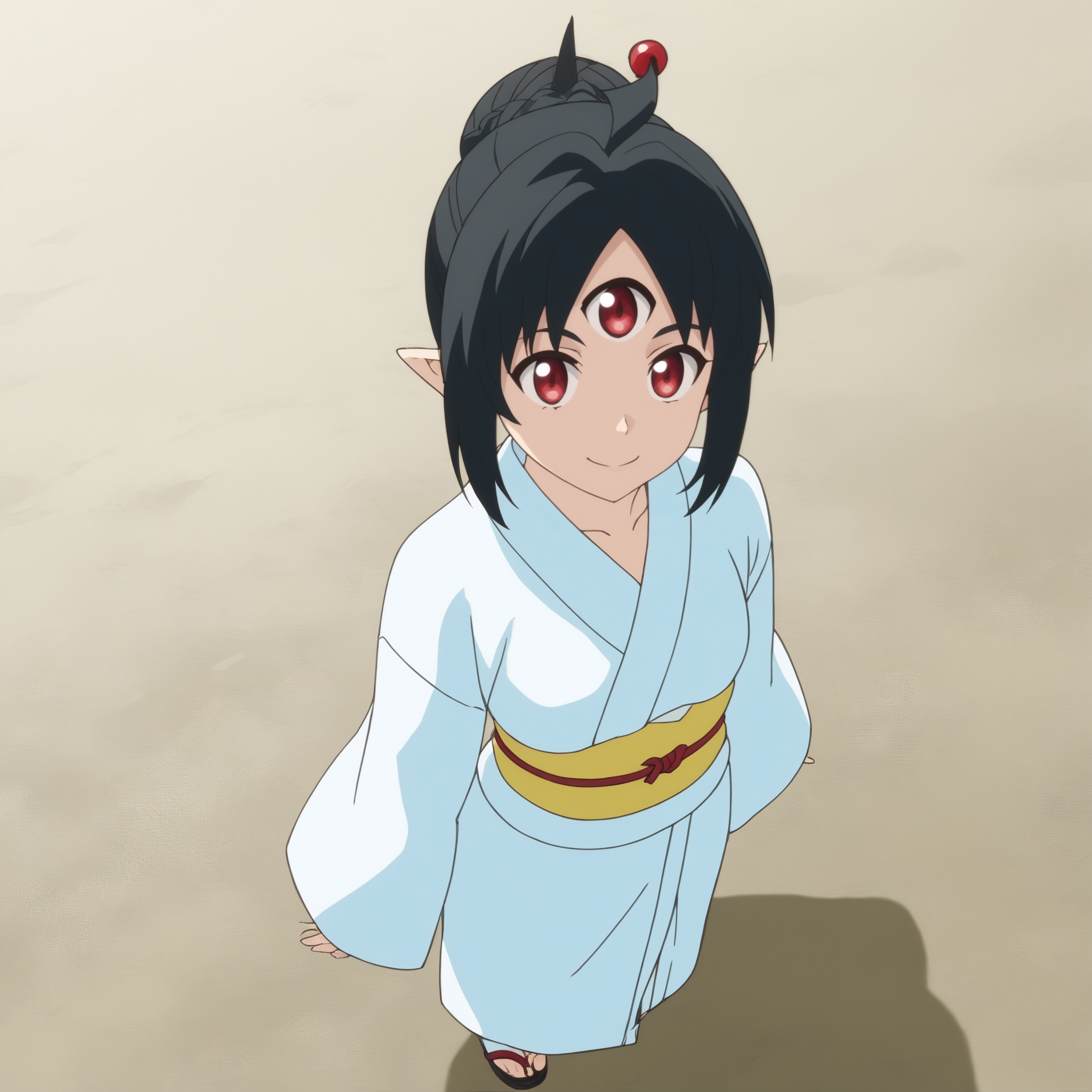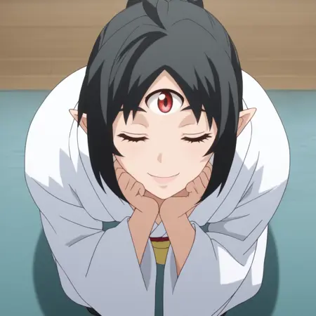 ReMonsterMe, red eyes, black hair, short hair, extra eyes, ahoge, third eye, single hair bun, pointy ears, hair ornament,