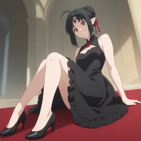 ReMonsterMe、赤い目、黒髪、短髪、追加の目、あほ毛、第三の目、片側の髪飾り、尖った耳、髪飾り、