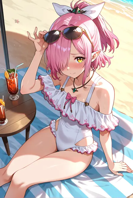 eyewear / sunglasses ( on head ) , necklace , white one-piece swimsuit , single bare shoulder , partially fingerless gloves , wristband , ribbon , frills , hip vent , ( white footwear ) ;
