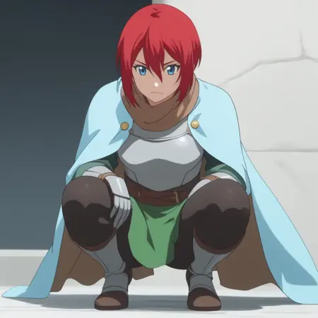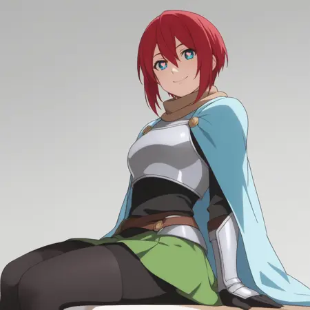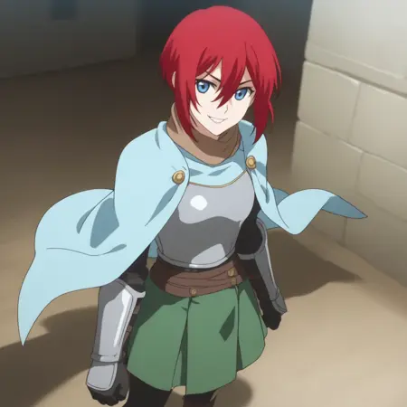 진한 녹색 치마, 갈색 스카프, 갑옷, 가슴판, 장갑, 파란색 망토, 망토, 장갑, 검은 팬티스타킹,