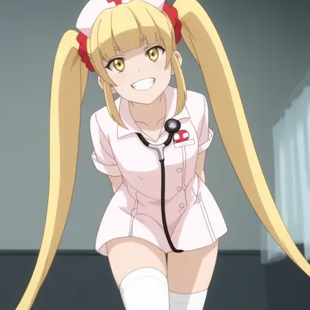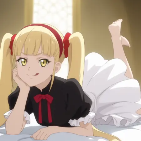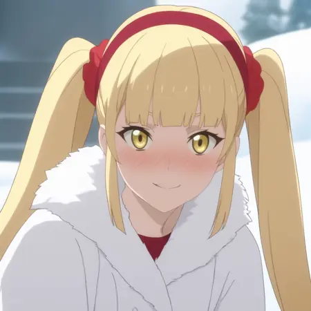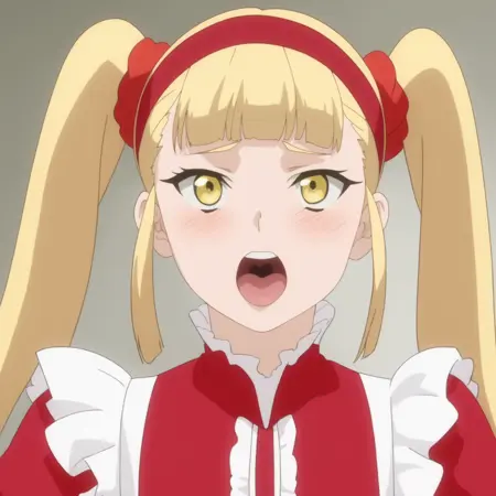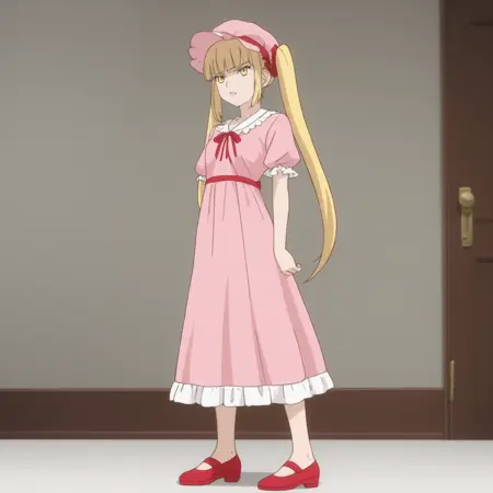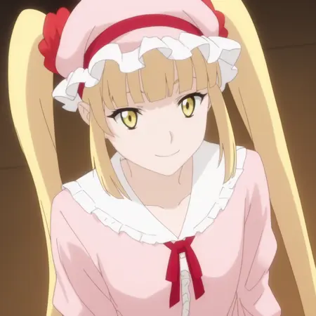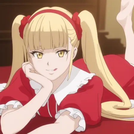 ReMonsterRubiria,黄色眼睛,金色头发,齐刘海,侧发,超长发,双马尾,红色发带,红色发圈,