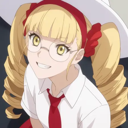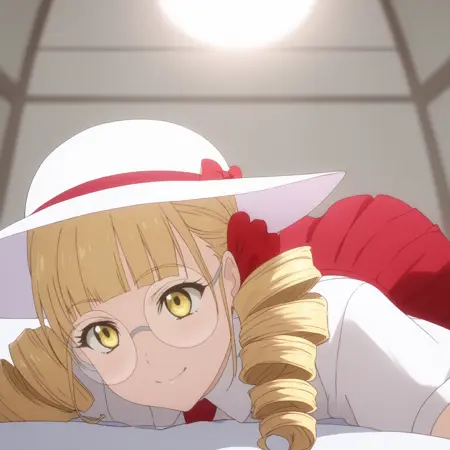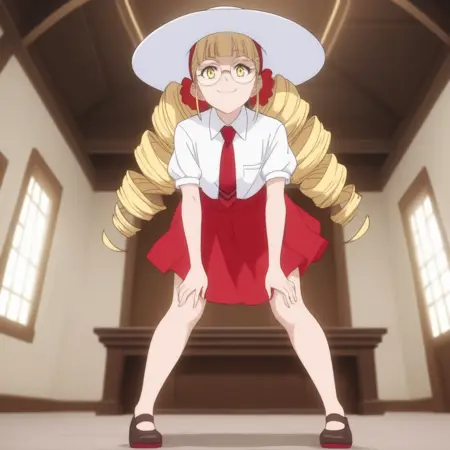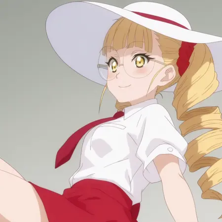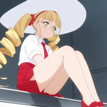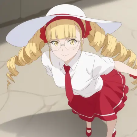 ReMonsterRubiriaUndercover,钻头发型,双钻头,白色帽子,太阳帽,红色丝带,红色短裙,白色衬衫,有领衬衫,短袖,眼镜,领带,圆形眼镜,