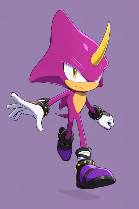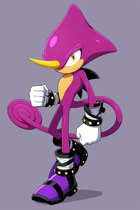 EspioSX, 1boy, vibrant purple skin, large yellow eyes, curled tail, black and purple boots, white gloves, sonic the hedgehog, yellow horn, espio the chameleon,