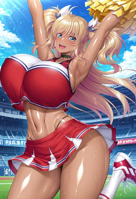 替代版本:第八套服装,深色肌肤绮罗罗,无袖上衣,红色上衣,耳环,啦啦队队员,啦啦队花球(啦啦队),红色短裙,白色袜子,运动鞋