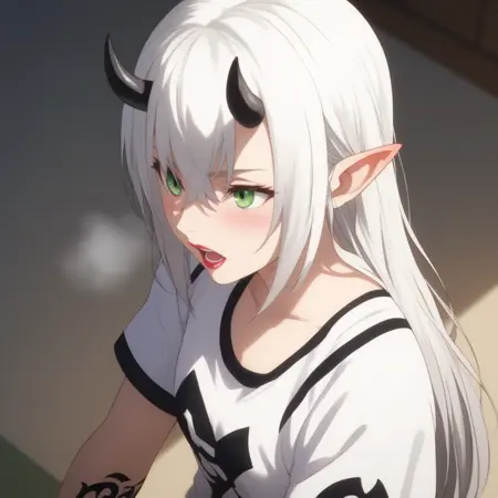 ReMonsterSei, 흰 머리, 녹색 눈, 뾰족한 귀, 눈 사이의 머리카락, 팔 문신, 검은 손톱, 창백한 피부, 립스틱,