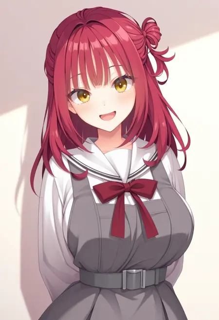 单侧发髻,一侧高起,半扎发,灰色腰带,灰色连衣裙,水手服背带裙,白色水手领,红色蝴蝶结,白色衬衫,