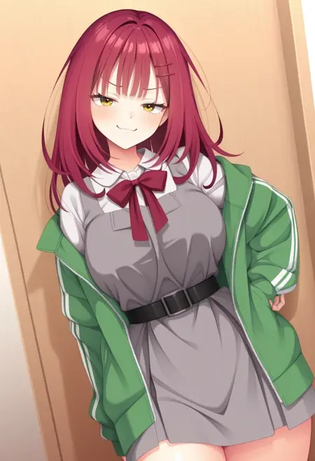 绿色夹克,黑色腰带,灰色连衣裙,白色衬衫,红色蝴蝶结,多枚发夹,背带裙,运动夹克,