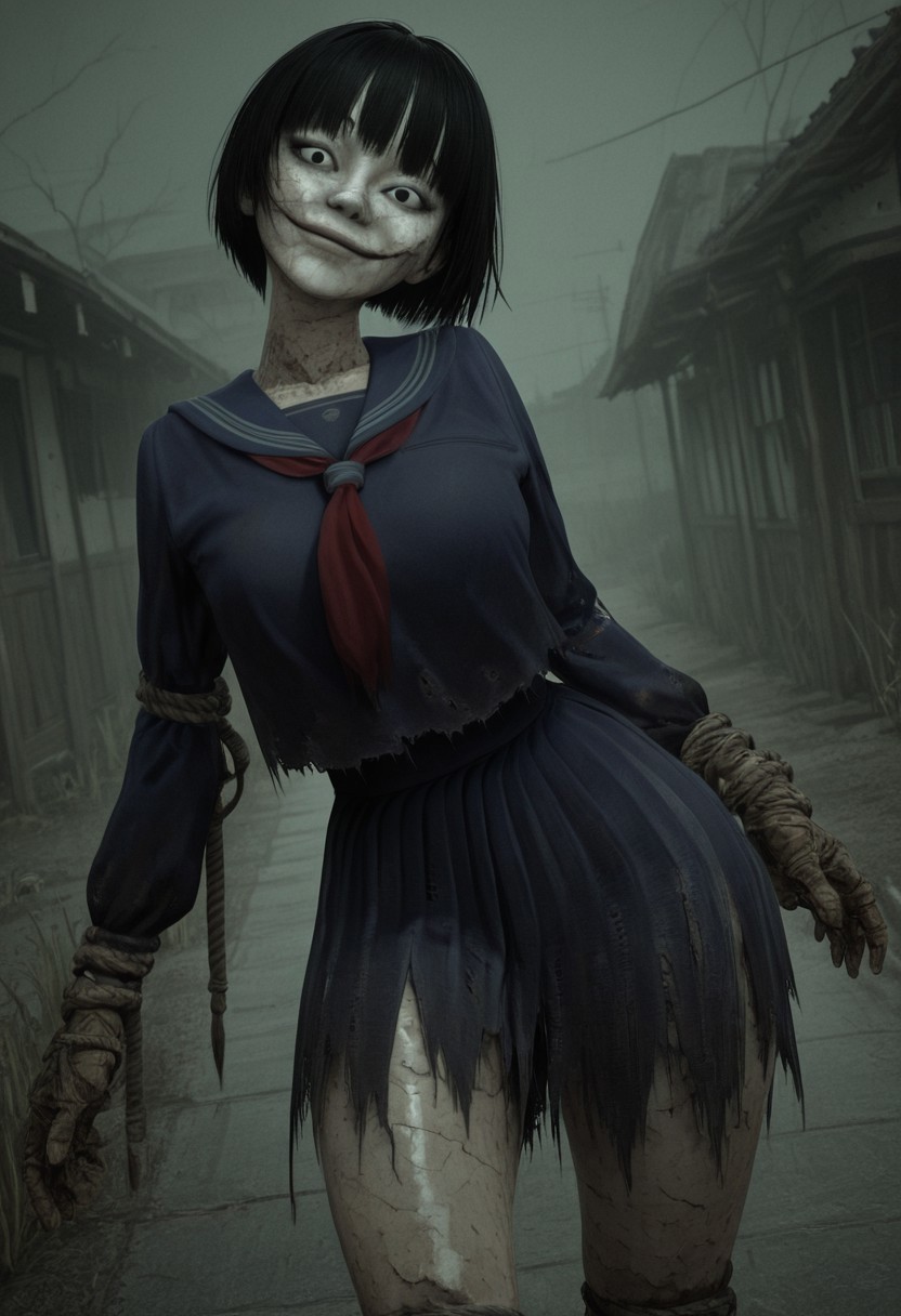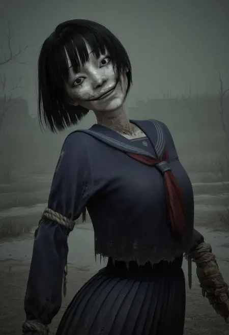 ayakakashi lora, 태그: 무서운 미소, 학교 Uniform, 찢어진 옷
