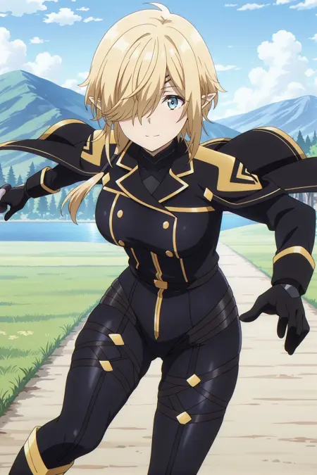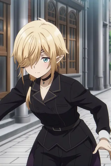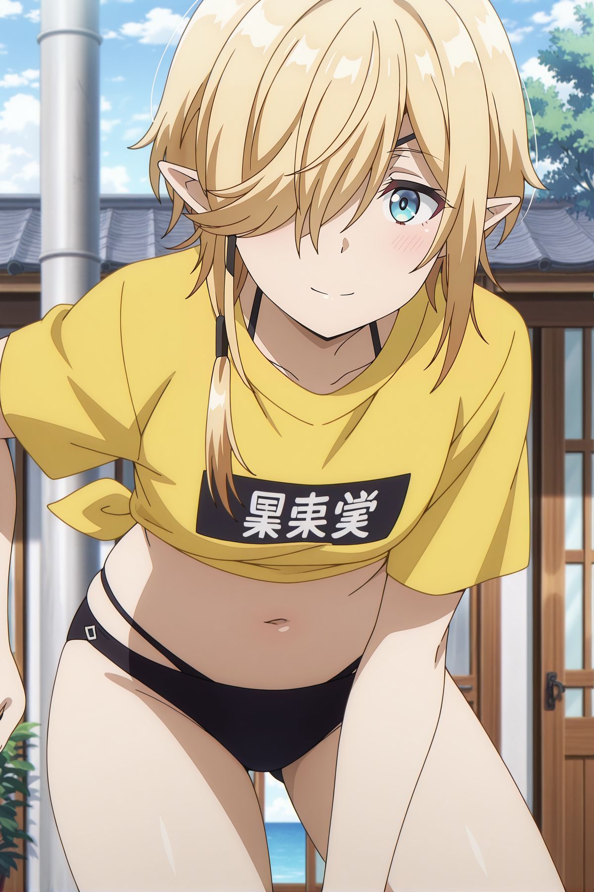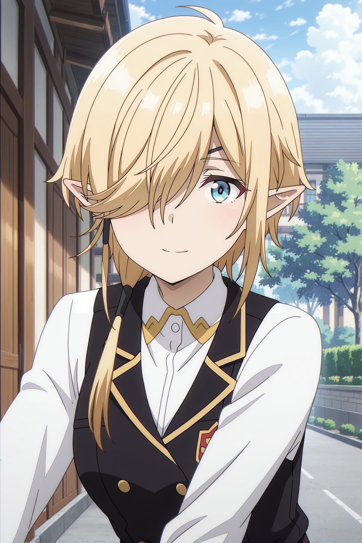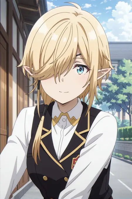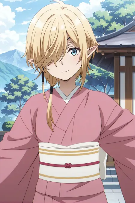 Chi, 1girl, solo, blue eyes, blonde hair, medium hair, single sidelock, low-tied sidelocks, pointy ears, one eye covered, elf,