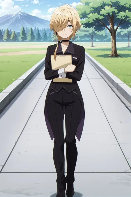 female butler, black choker, collared suit, black suit, tailcoat, black pants,