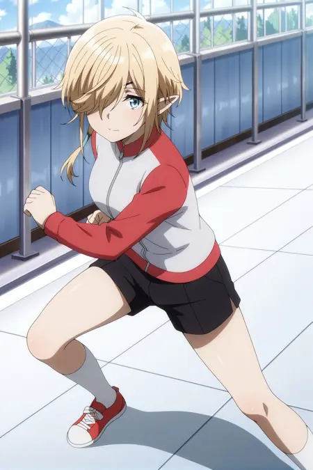 gym uniform, two-tone shirt, red shirt, grey shirt, long sleeves, black shorts, red shoes,