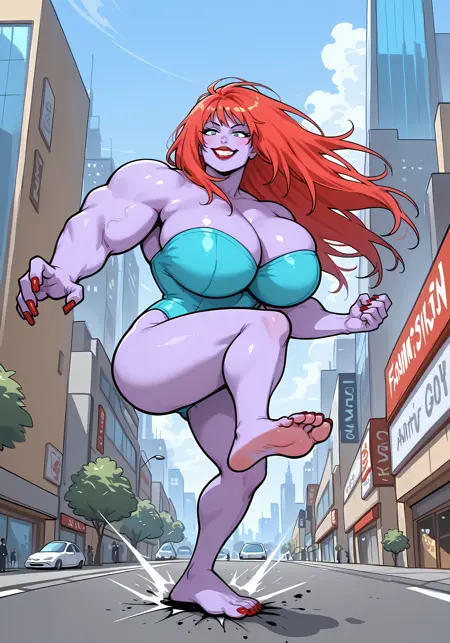 shething, red hair, messy hair, red lips, black eyes, lipstick, aqua leotard, cleavage, red nail polish, red nails, red toenails, barefoot, purple skin, colored skin, muscular