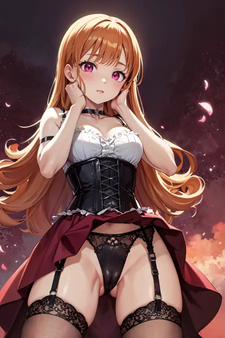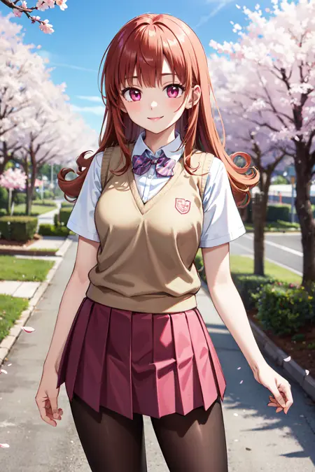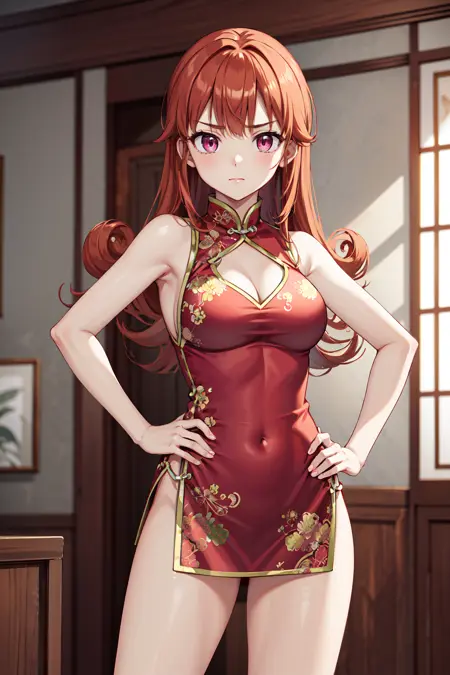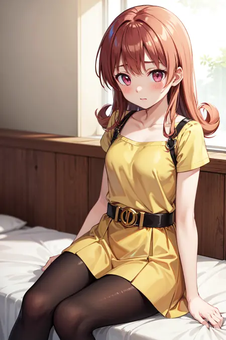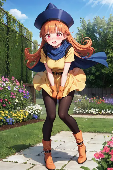 - alena,hat,long hair,curly hair,pink eyes,earrings,cape,yellow dress,short sleeves,gloves,belt,skirt,black pantyhose,boots