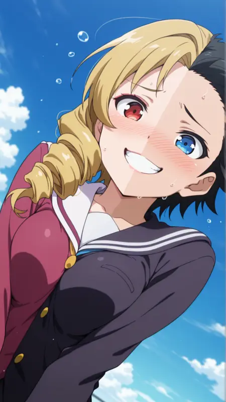 外見: 金髪、ドリル髪、青い目、赤い目、異色瞳、長い髪、黒髪、非対称な髪、ツートーンヘア、非対称な服、多色髪、短髪、スプリットテーマ、