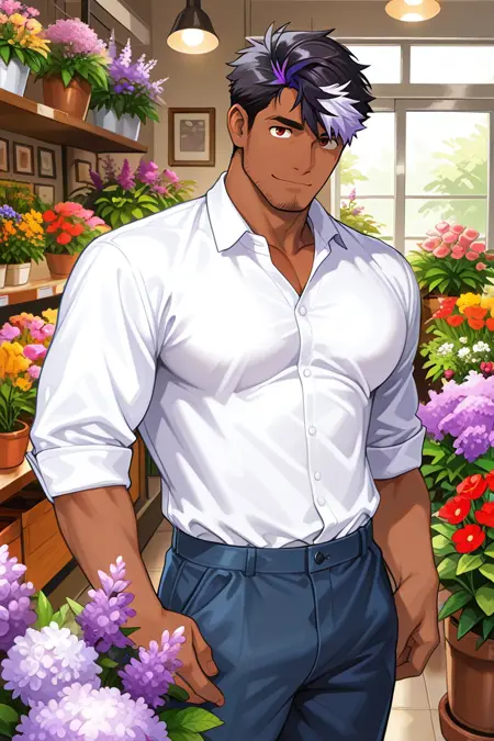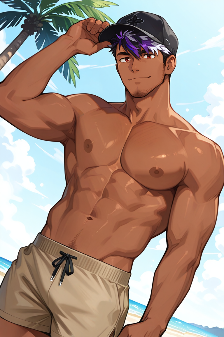 Body: dark skin, short hair, red eyes, black hair, white hair, purple hair, streaked hair, multicolored hair, facial hair, stubble
