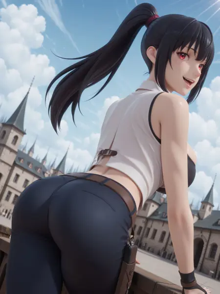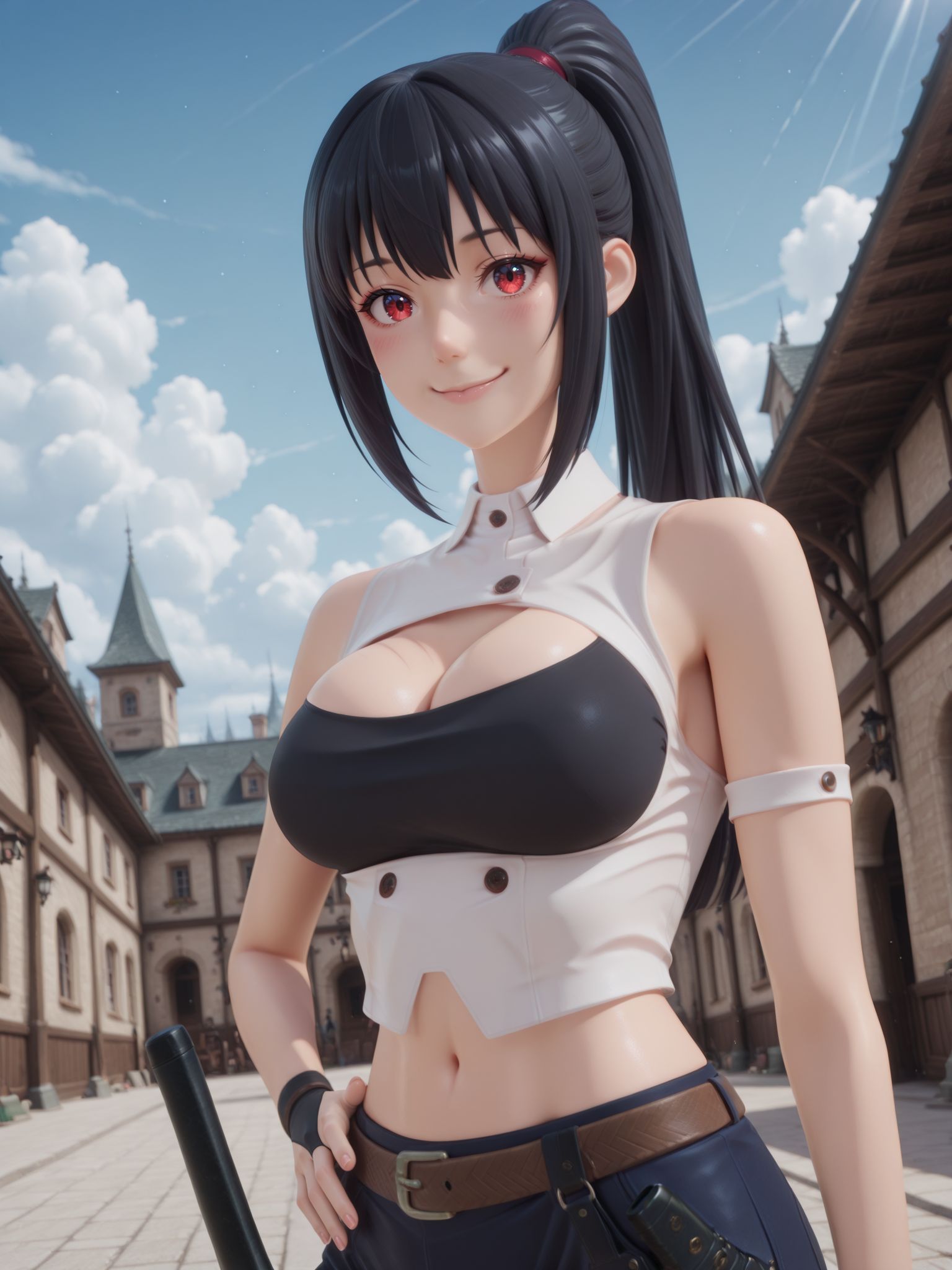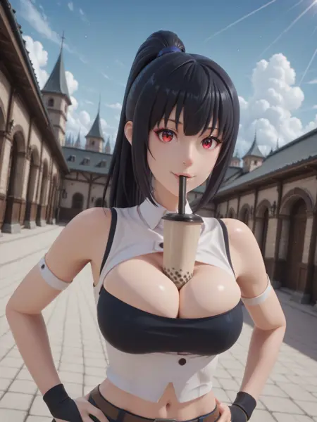프롬프트: 1girl, solo, curvy, long hair, black hair, high ponytail, hair ornament, bangs, sidelocks, red eyes, large breasts,